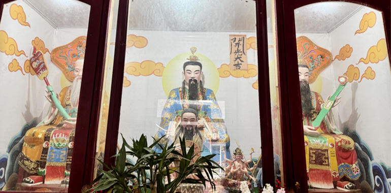 三清殿的始建年代虽无确切纪年可考,但据殿内遗存及地方文献推断,其规制在清代已趋完备,历代屡经修葺,仍保留着古朴庄重的建筑风貌。殿宇遵循道教“居中为尊”的布局理念,飞檐翘角,雕梁画栋,斗拱交错间尽显江南古建筑的精巧雅致,与台州道教建筑“融于自然、天人同构”的审美追求一脉相承。殿内梁柱巍峨,轩敞明亮,香火缭绕中,诸神像庄严肃穆,尽显道家风范。 作为道教信仰的核心殿堂,三清殿的供奉体系兼具正统道统与地方文化特色。正中供奉三清道祖——玉清元始天尊、上清灵宝天尊、太清道德天尊,三圣趺坐于莲台之上,神态凝重,衣褶流转,象征着“道生一、一生二、二生三、三生万物”的宇宙本源教义,是道教最高神祇的神圣象征。左侧供奉伏羲祖师,这位中华民族的人文先始,手持八卦图,寓意着开天辟地、教化万民的创世之功,其供奉体现了道教与中华传统文化的深厚渊源。右侧供奉斗姆元君,作为北斗众星之母,元君慈眉善目,手持法器,掌管星辰运转与人间祸福,是信众祈愿平安顺遂的重要祭拜对象。殿内两侧则依次排列六十君子星君,诸神像神态各异,与天干地支相配,对应人间流年运势,构成了完整的星辰崇拜体系,反映了道教“天人感应”的核心思想。