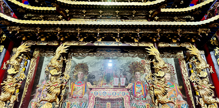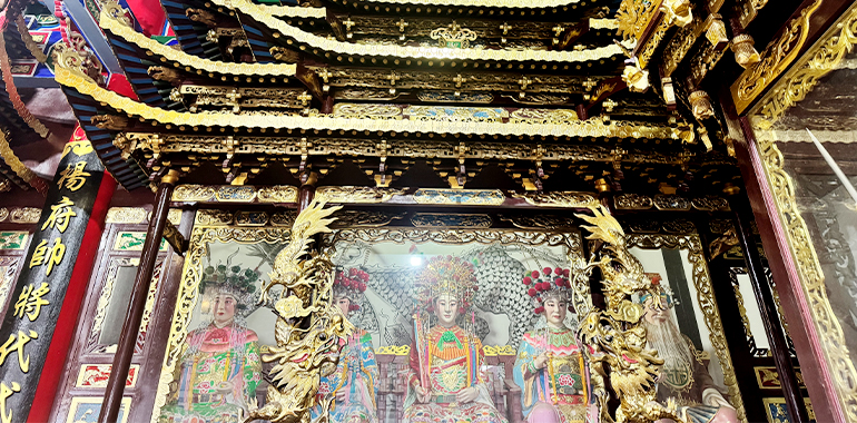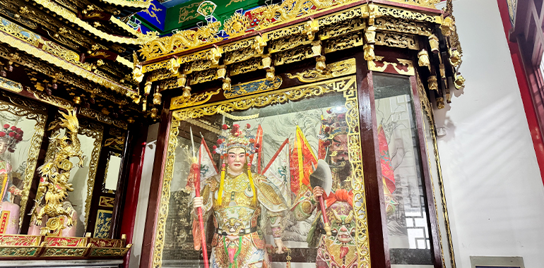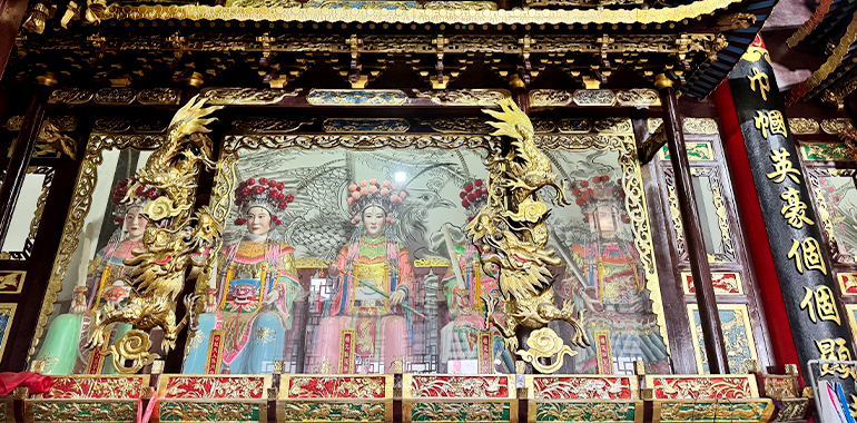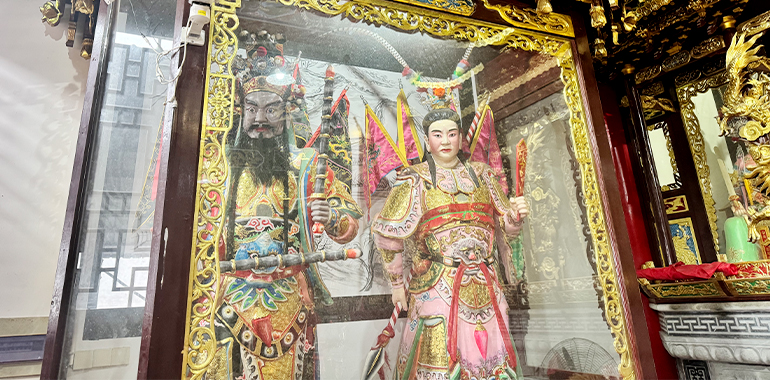 殿内正中,杨府三大神端坐之上,金面威严,神情肃穆,共同构成了杨家将忠烈精神的核心象征。杨令公身披铠甲,手持长枪,再现了“陈家谷血战”中宁死不屈的忠勇风骨;佘太君头戴凤冠,目光坚毅,彰显了“百岁挂帅”的家国担当;杨延昭手持令箭,神态沉稳,复刻了镇守三关、威震辽邦的名将风范。三位神祇的供奉,既是对杨家将核心人物的缅怀,更传递着“一门忠烈、世代相传”的忠义理念,成为后世敬仰的精神标杆。